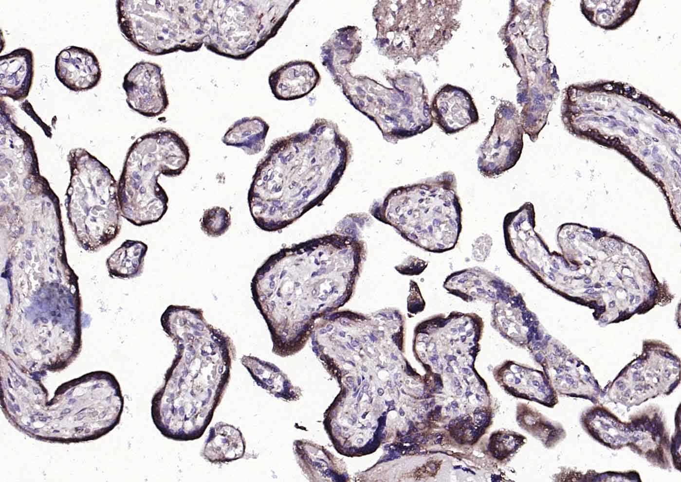Paraformaldehyde-fixed, paraffin embedded (human placenta); Antigen retrieval by boiling in sodium citrate buffer (pH6.0) for 15min; Block endogenous peroxidase by 3% hydrogen peroxide for 20 minutes; Blocking buffer (normal goat serum) at 37°C for 30min; Incubation with (Cyclophilin B(Loading Control) ) Monoclonal Antibody, Unconjugated (bsm-33228M) at 1:200 overnight at 4°C, followed by operating according to SP Kit(Mouse)(sp-0024) instructionsand DAB staining.