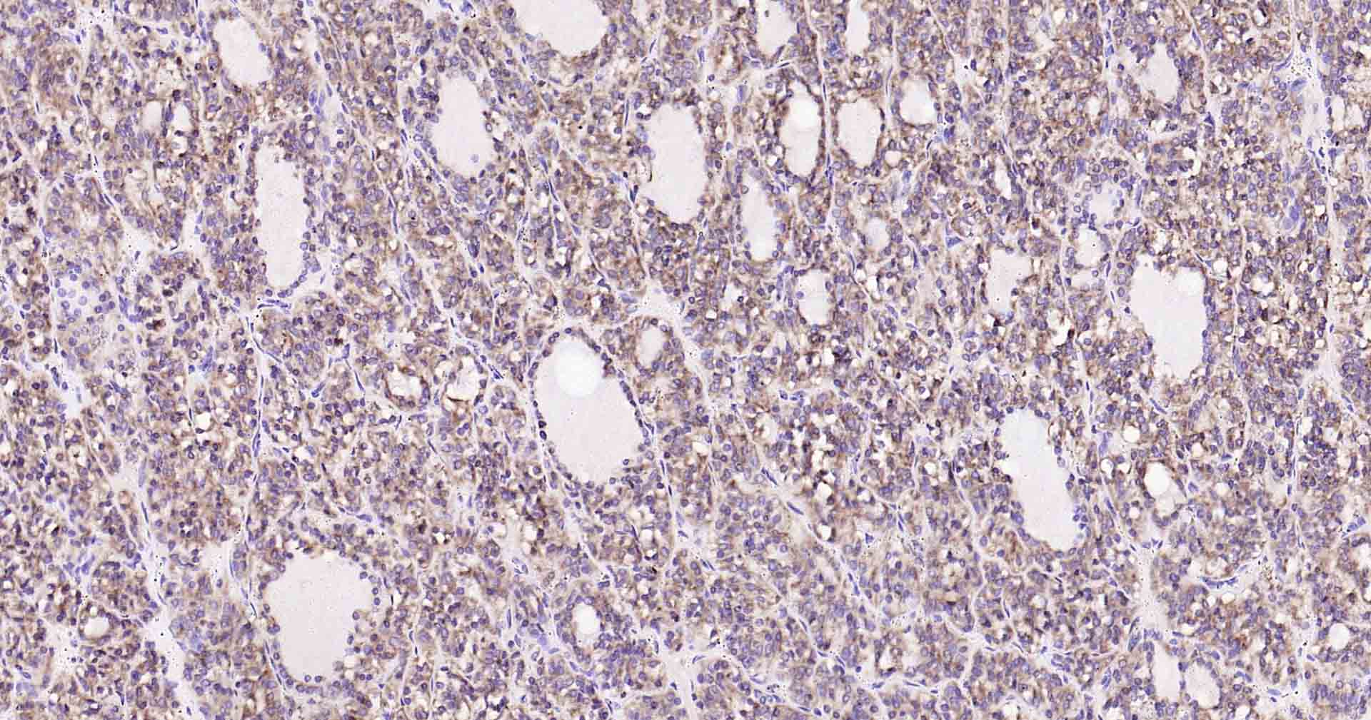 Paraformaldehyde-fixed, paraffin embedded Human Thyroid Gland; Antigen retrieval by boiling in sodium citrate buffer (pH6.0) for 15 min; Antibody incubation with Cyclophilin B(Loading Control) Monoclonal Antibody, Unconjugated(bsm-33228M) at 1:200 overnight at 4°C, followed by conjugation to the SP Kit (Mouse, sp-0024) and DAB (C-0010) staining.
