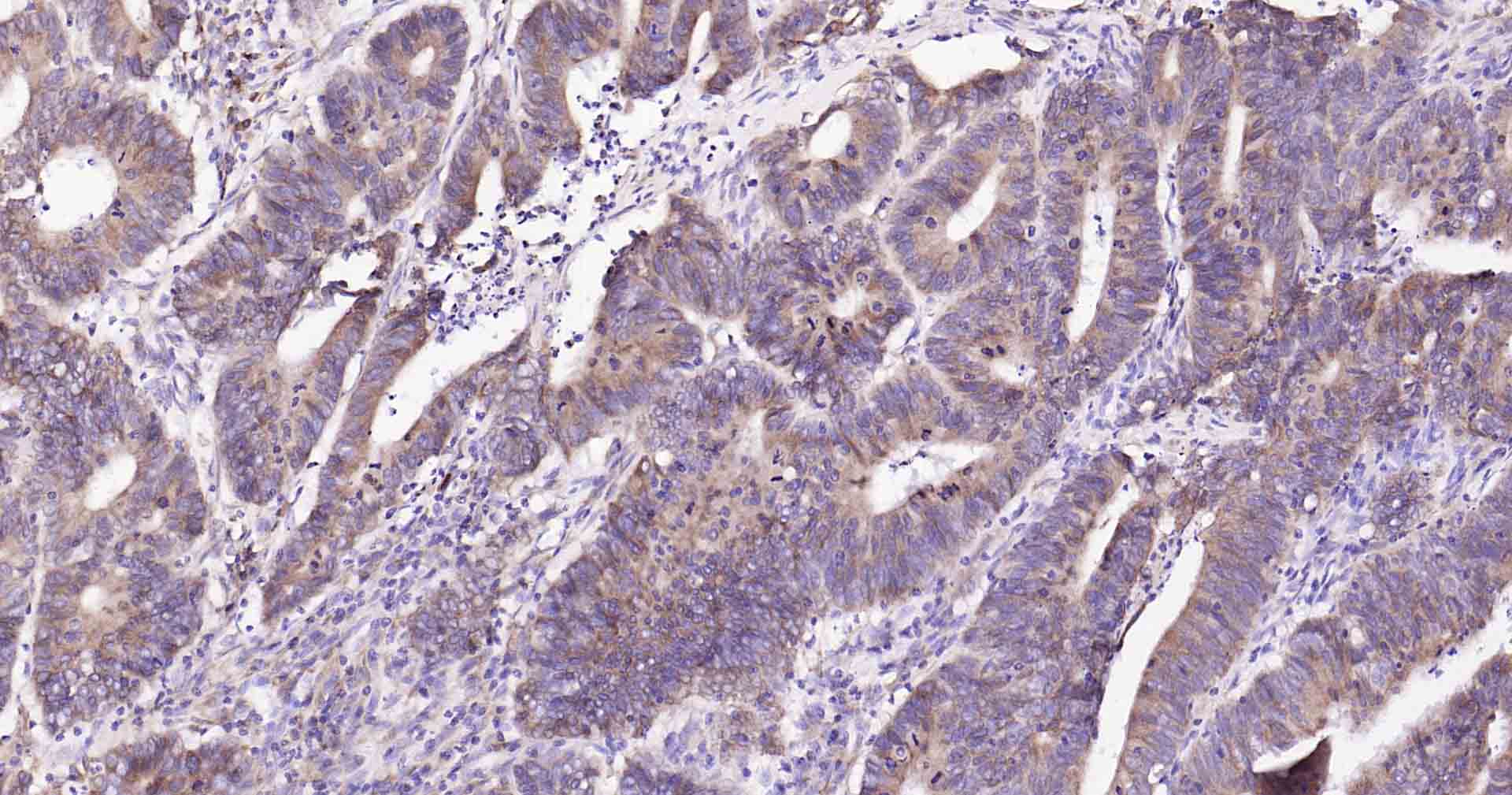 Paraformaldehyde-fixed, paraffin embedded Human Colon Cancer; Antigen retrieval by boiling in sodium citrate buffer (pH6.0) for 15 min; Antibody incubation with Cyclophilin B(Loading Control) Monoclonal Antibody, Unconjugated(bsm-33228M) at 1:200 overnight at 4°C, followed by conjugation to the SP Kit (Mouse, sp-0024) and DAB (C-0010) staining.