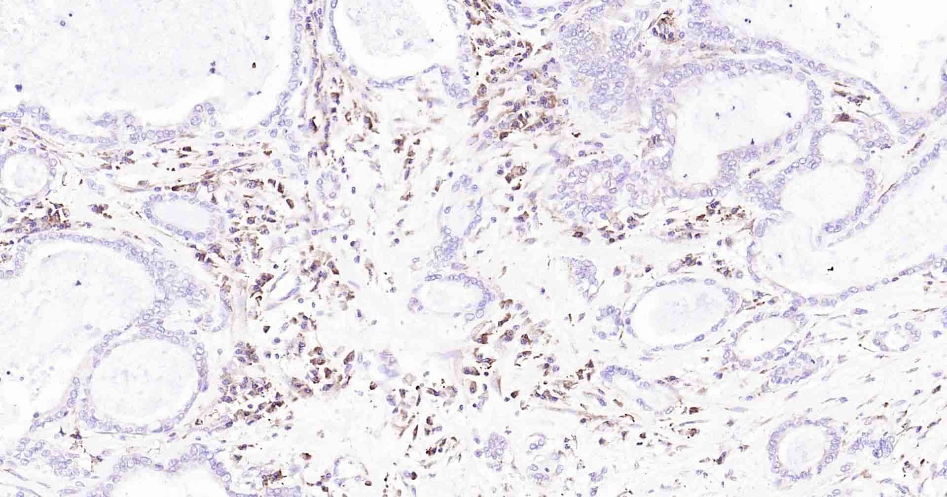 Paraformaldehyde-fixed, paraffin embedded (human intestine); Antigen retrieval by boiling in sodium citrate buffer (pH6.0) for 15min; Block endogenous peroxidase by 3% hydrogen peroxide for 20 minutes; Blocking buffer (normal goat serum) at 37°C for 30min; Incubation with (Cyclophilin B(Loading Control) ) Monoclonal Antibody, Unconjugated (bsm-33228M) at 1:200 overnight at 4°C, followed by operating according to SP Kit(Mouse)(sp-0024) instructionsand DAB staining.
