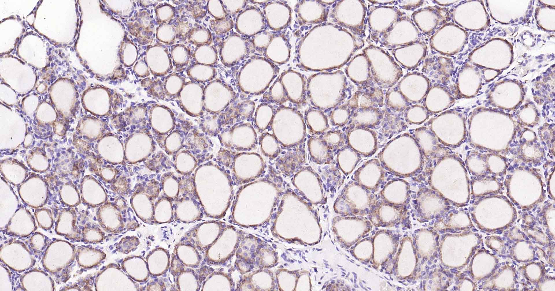 Paraformaldehyde-fixed, paraffin embedded Rat Thyroid Gland; Antigen retrieval by boiling in sodium citrate buffer (pH6.0) for 15 min; Antibody incubation with Cyclophilin B(Loading Control) Monoclonal Antibody, Unconjugated(bsm-33228M) at 1:200 overnight at 4°C, followed by conjugation to the SP Kit (Mouse, sp-0024) and DAB (C-0010) staining.