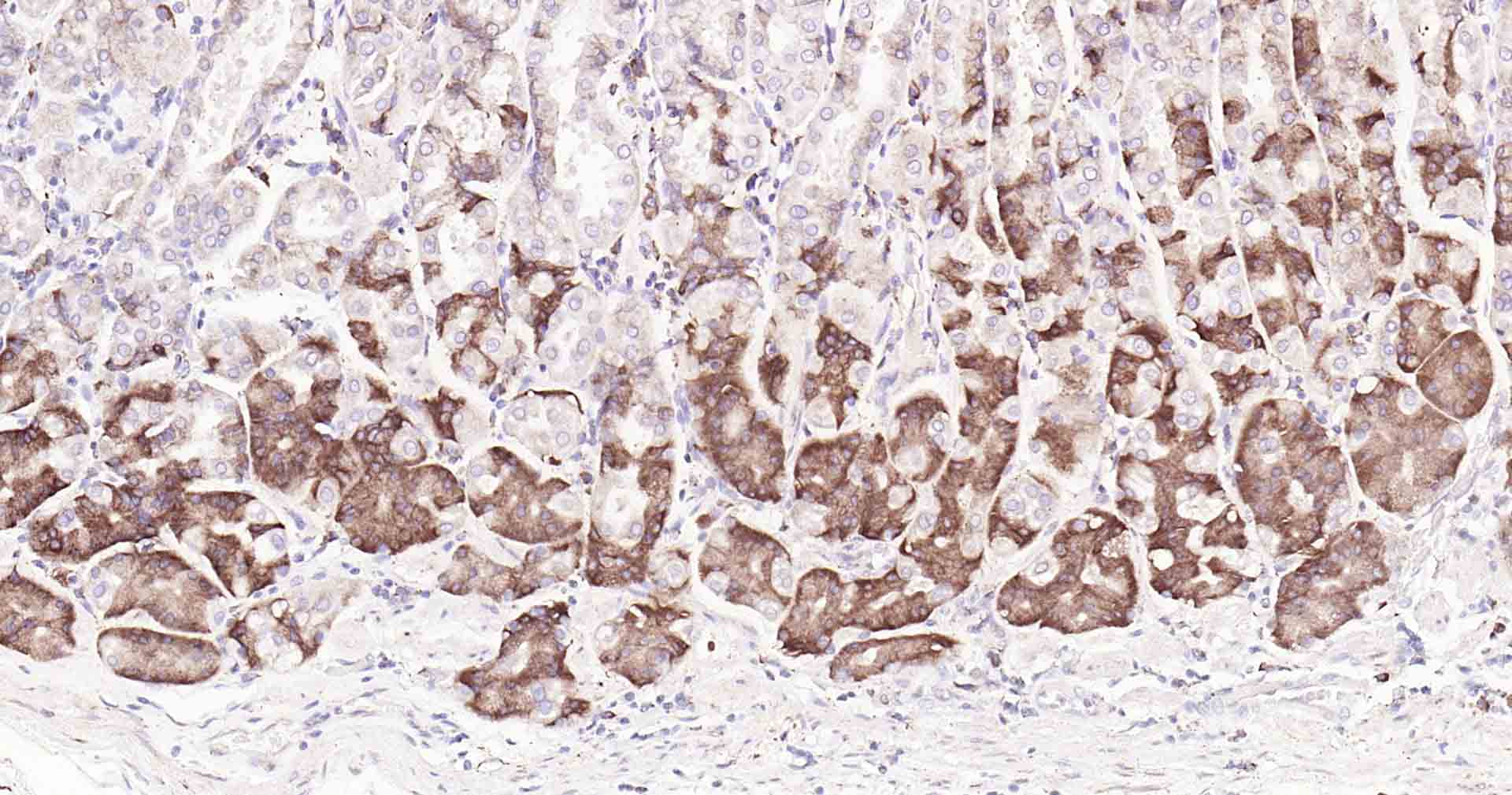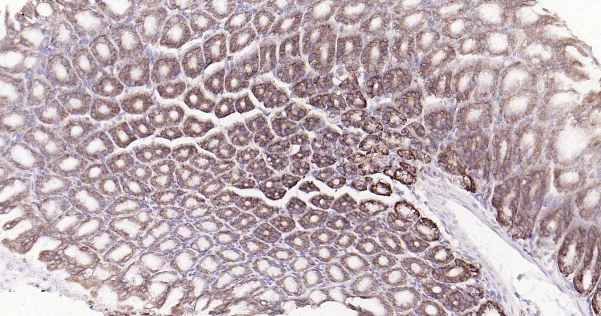 Paraformaldehyde-fixed, paraffin embedded Mouse Stomach; Antigen retrieval by boiling in sodium citrate buffer (pH6.0) for 15 min; Antibody incubation with Cyclophilin B(Loading Control) Monoclonal Antibody, Unconjugated(bsm-33228M) at 1:200 overnight at 4°C, followed by conjugation to the SP Kit (Mouse, sp-0024) and DAB (C-0010) staining.