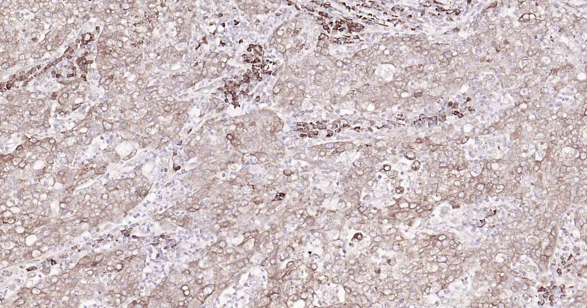Paraformaldehyde-fixed, paraffin embedded Human Liver Cancer; Antigen retrieval by boiling in sodium citrate buffer (pH6.0) for 15 min; Antibody incubation with Cyclophilin B(Loading Control) Monoclonal Antibody, Unconjugated(bsm-33228M) at 1:200 overnight at 4°C, followed by conjugation to the SP Kit (Mouse, sp-0024) and DAB (C-0010) staining.