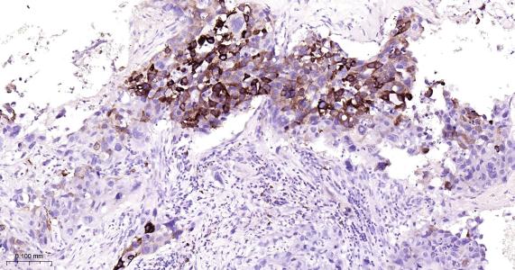 Paraformaldehyde-fixed, paraffin embedded Human Lung Cancer; Antigen retrieval by boiling in sodium citrate buffer (pH6.0) for 15 min; Antibody incubation with Cyclooxygenase 2 Monoclonal Antibody, Unconjugated(bsm-52502R) at 1:200 overnight at 4°C, followed by conjugation to the bs-0295G-HRP and DAB (C-0010) staining.