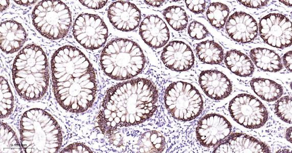 Paraformaldehyde-fixed, paraffin embedded Mouse Colon; Antigen retrieval by boiling in sodium citrate buffer (pH6.0) for 15 min; Antibody incubation with Cyclooxygenase 2 Monoclonal Antibody, Unconjugated(bsm-52502R) at 1:200 overnight at 4°C, followed by conjugation to the bs-0295G-HRP and DAB (C-0010) staining.