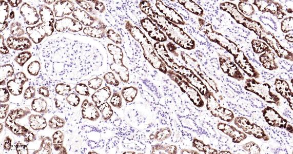 Paraformaldehyde-fixed, paraffin embedded Human Kidney; Antigen retrieval by boiling in sodium citrate buffer (pH6.0) for 15 min; Antibody incubation with Cyclooxygenase 2 Monoclonal Antibody, Unconjugated(bsm-52502R) at 1:200 overnight at 4°C, followed by conjugation to the bs-0295G-HRP and DAB (C-0010) staining.