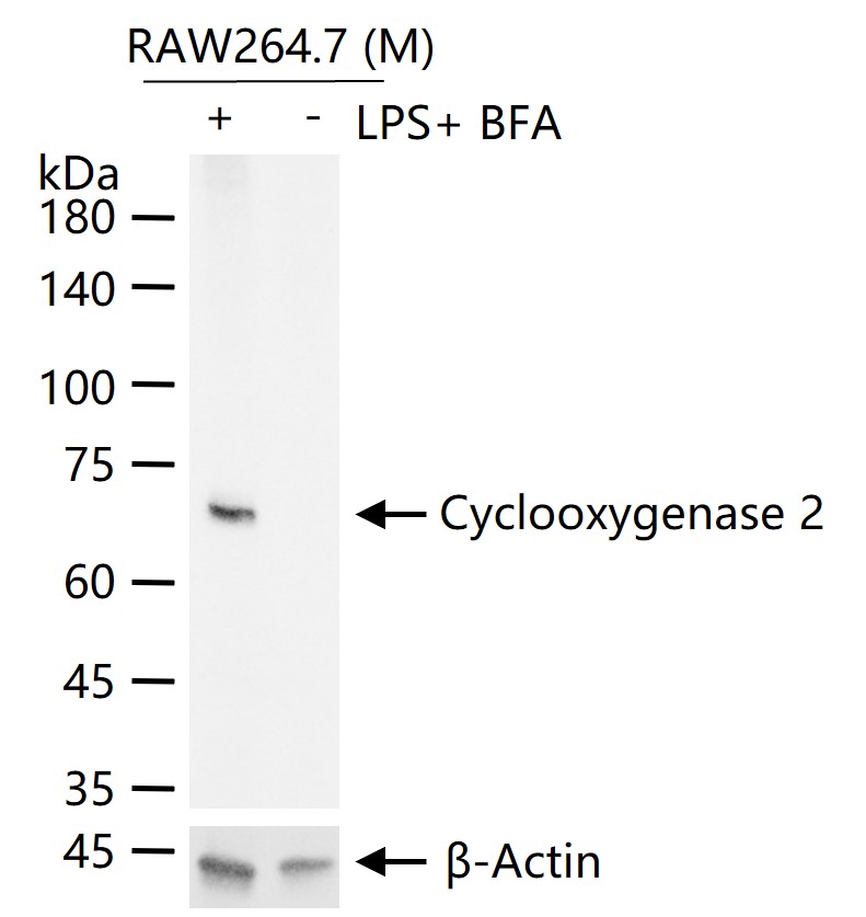 RAW264.7 (M) cells were treated with or without LPS+BFA (100 ng/mL) for 6 h, 25 μg total protein per lane of cell lysates (see on figure) probed with Cyclooxygenase 2 monoclonal antibody, unconjugated (bsm-52502R) at 1:1000 dilution and 4°C overnight incubation. Followed by conjugated secondary antibody incubation at r.t. for 60 min.