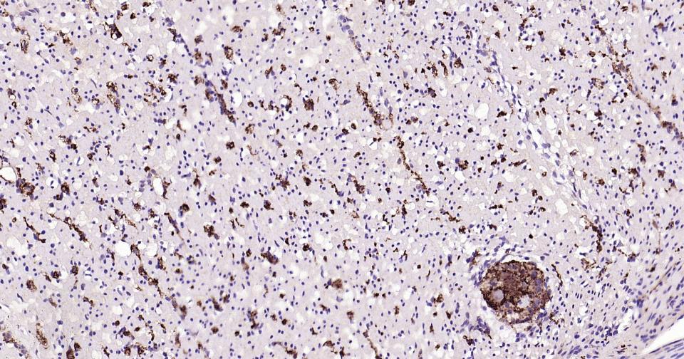 Paraformaldehyde-fixed, paraffin embedded (rat brain); Antigen retrieval by boiling in sodium citrate buffer (pH6.0) for 15min; Block endogenous peroxidase by 3% hydrogen peroxide for 20 minutes; Blocking buffer (normal goat serum) at 37°C for 30min; Incubation with (Synaptophysin) Monoclonal Antibody, Unconjugated (bsm-52379R) at 1:100 overnight at 4°C, followed by operating according to SP Kit(Rabbit) (sp-0023)instructionsand DAB staining.
