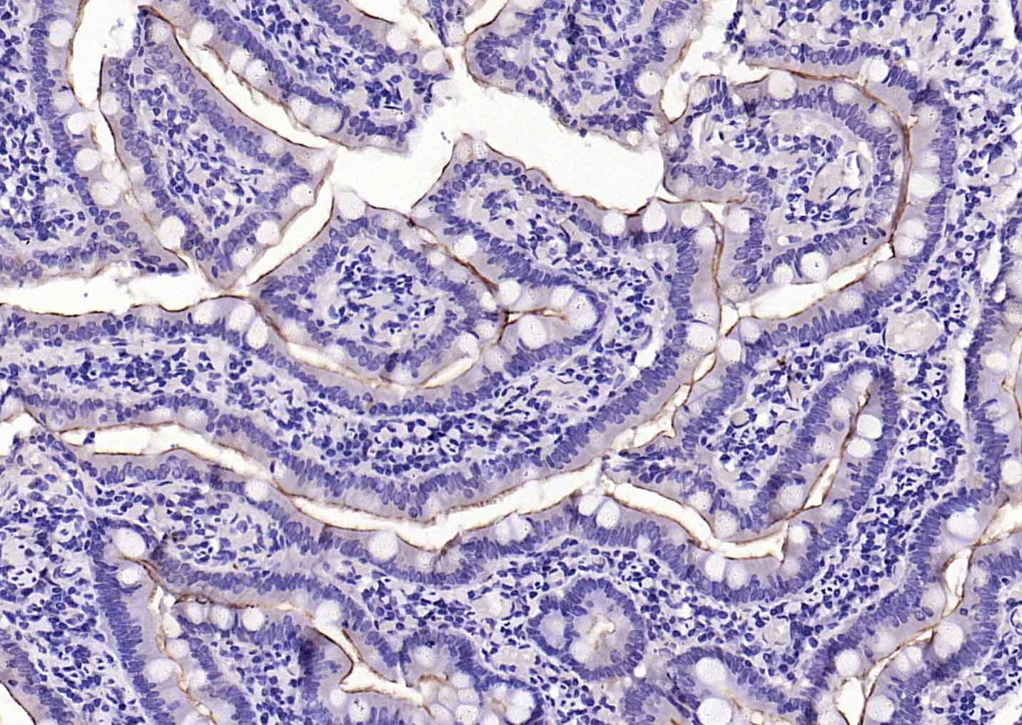 Paraformaldehyde-fixed, paraffin embedded (Human duodenum); Antigen retrieval by boiling in sodium citrate buffer (pH6.0) for 15min; Block endogenous peroxidase by 3% hydrogen peroxide for 20 minutes; Blocking buffer (normal goat serum) at 37°C for 30min; Antibody incubation with (ACE2) Polyclonal Antibody, Unconjugated (bs-46001R) at 1:200 overnight at 4°C, followed by operating according to SP Kit(Rabbit) (sp-0023) instructionsand DAB staining.