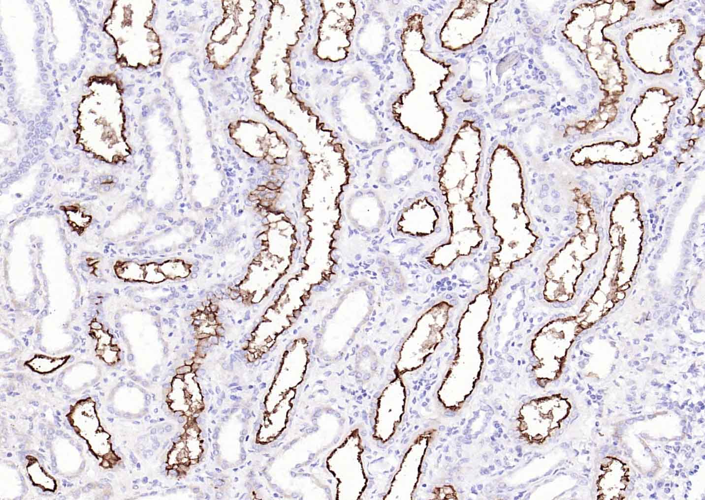Paraformaldehyde-fixed, paraffin embedded (Human kidney); Antigen retrieval by boiling in sodium citrate buffer (pH6.0) for 15min; Block endogenous peroxidase by 3% hydrogen peroxide for 20 minutes; Blocking buffer (normal goat serum) at 37°C for 30min; Antibody incubation with (ACE2) Polyclonal Antibody, Unconjugated (bs-46001R) at 1:200 overnight at 4°C, followed by operating according to SP Kit(Rabbit) (sp-0023) instructionsand DAB staining.