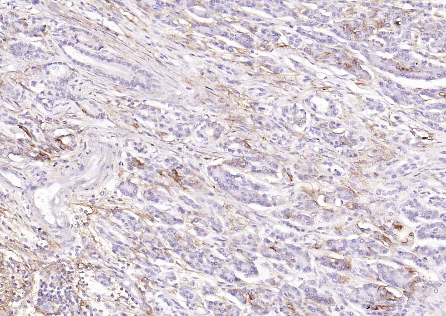 Paraformaldehyde-fixed, paraffin embedded (human pancreatic carcinoma); Antigen retrieval by boiling in sodium citrate buffer (pH6.0) for 15min; Block endogenous peroxidase by 3% hydrogen peroxide for 20 minutes; Blocking buffer (normal goat serum) at 37°C for 30min; Antibody incubation with (ACE2) Polyclonal Antibody, Unconjugated (bs-46001R) at 1:200 overnight at 4°C, followed by operating according to SP Kit(Rabbit) (sp-0023) instructionsand DAB staining.
