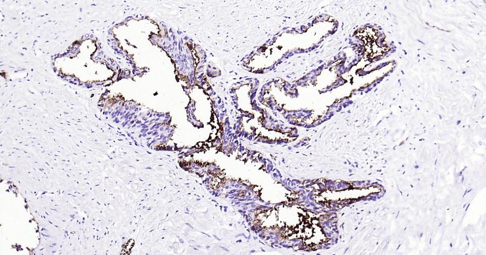 Paraformaldehyde-fixed, paraffin embedded Human Prostate; Antigen retrieval by boiling in sodium citrate buffer (pH6.0) for 15 min; Antibody incubation with CD13 Monoclonal Antibody, Unconjugated(bsm-60371R) at 1:200 overnight at 4°C, followed by conjugation to the SP Kit (Rabbit, SP-0023) and DAB (C-0010) staining.
