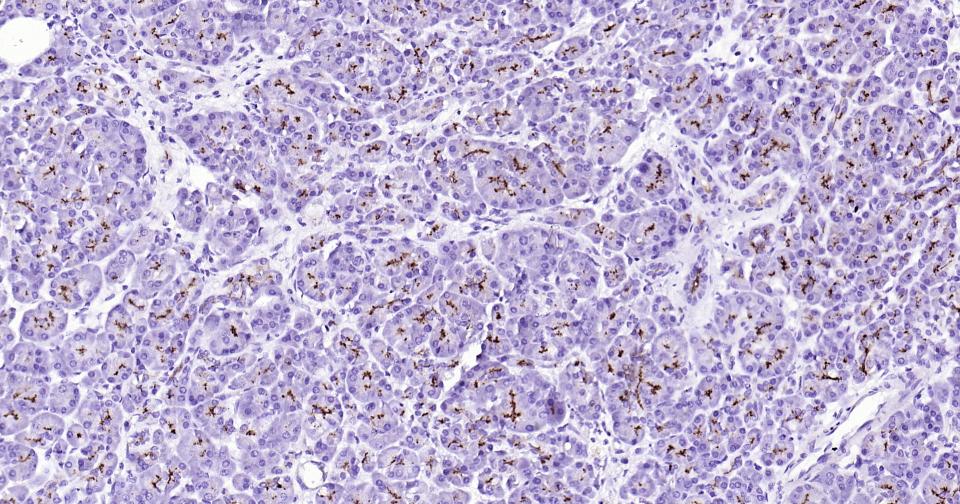 Paraformaldehyde-fixed, paraffin embedded Human Pancreatic Cancer; Antigen retrieval by boiling in sodium citrate buffer (pH6.0) for 15 min; Antibody incubation with CD13 Monoclonal Antibody, Unconjugated(bsm-60371R) at 1:200 overnight at 4°C, followed by conjugation to the SP Kit (Rabbit, SP-0023) and DAB (C-0010) staining.