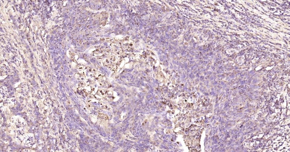 Paraformaldehyde-fixed, paraffin embedded Human Cervical Cancer; Antigen retrieval by boiling in sodium citrate buffer (pH6.0) for 15 min; Antibody incubation with CD13 Monoclonal Antibody, Unconjugated(bsm-60371R) at 1:200 overnight at 4°C, followed by conjugation to the SP Kit (Rabbit, SP-0023) and DAB (C-0010) staining.