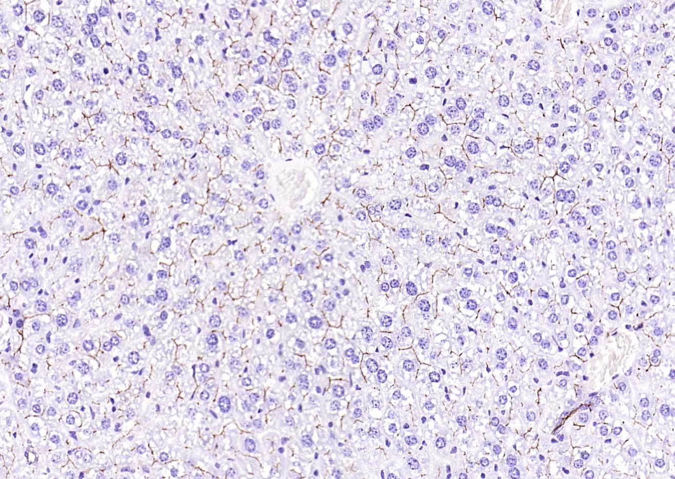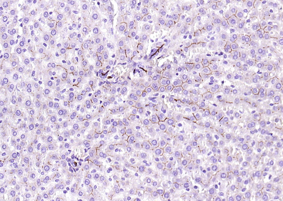 Paraformaldehyde-fixed, paraffin embedded (rat liver); Antigen retrieval by boiling in sodium citrate buffer (pH6.0) for 15min; Block endogenous peroxidase by 3% hydrogen peroxide for 20 minutes; Blocking buffer (normal goat serum) at 37°C for 30min; Antibody incubation with (CD13) Monoclonal Antibody, Unconjugated (bsm-60371R) at 1:200 overnight at 4°C, followed by operating according to SP Kit(Rabbit) (sp-0023) instructionsand DAB staining.