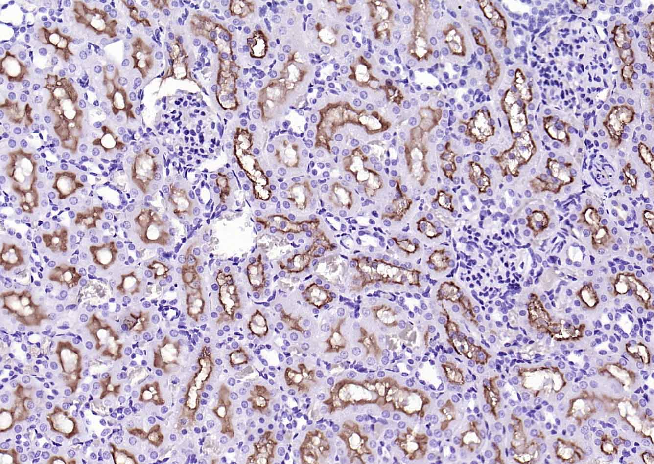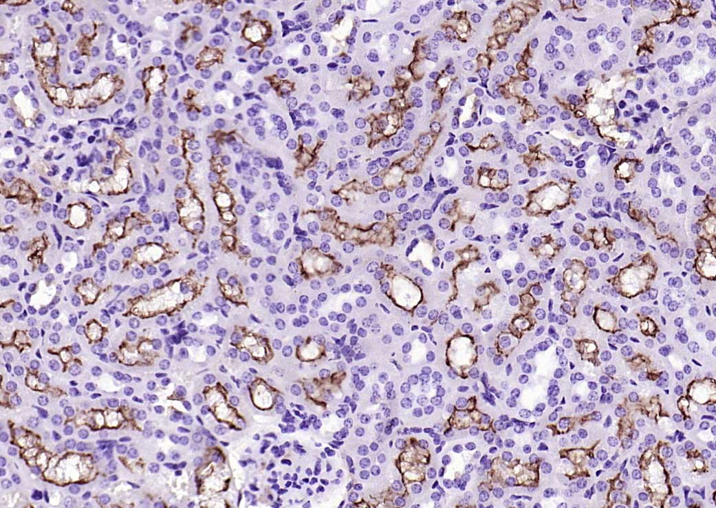 Paraformaldehyde-fixed, paraffin embedded (rat kidney); Antigen retrieval by boiling in sodium citrate buffer (pH6.0) for 15min; Block endogenous peroxidase by 3% hydrogen peroxide for 20 minutes; Blocking buffer (normal goat serum) at 37°C for 30min; Antibody incubation with (CD13) Monoclonal Antibody, Unconjugated (bsm-60371R) at 1:200 overnight at 4°C, followed by operating according to SP Kit(Rabbit) (sp-0023) instructionsand DAB staining.