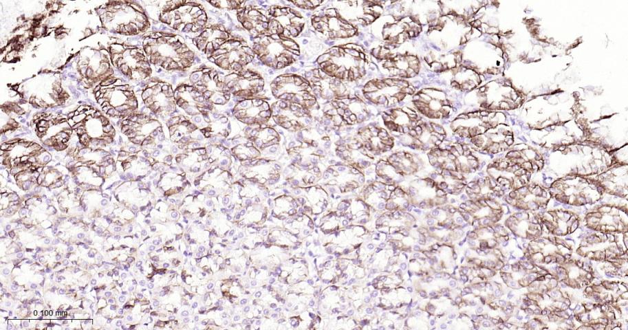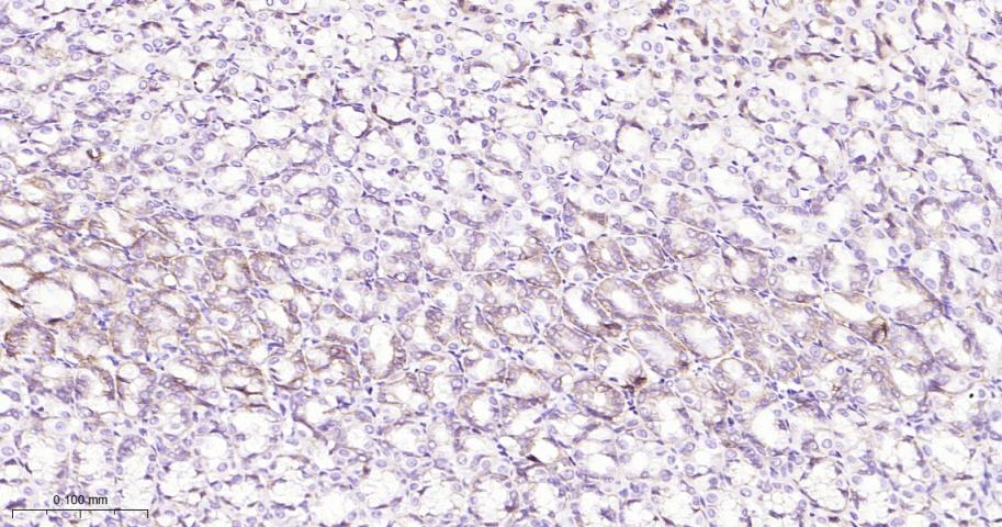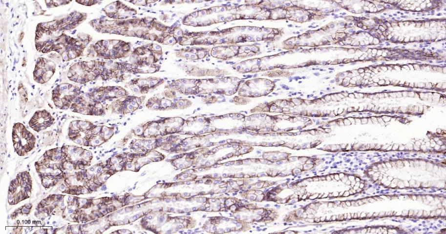 Paraformaldehyde-fixed, paraffin embedded Rat Stomach; Antigen retrieval by boiling in sodium citrate buffer (pH6.0) for 15 min; Antibody incubation with Claudin 18.2 Monoclonal Antibody, Unconjugated(bsm-60637R) at 1:300 overnight at 4°C, followed by conjugation to the bs-0295G-HRP and DAB (C-0010) staining.