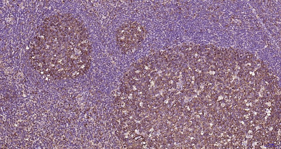 Paraformaldehyde-fixed, paraffin embedded Human Tonsil; Antigen retrieval by boiling in sodium citrate buffer (pH6.0) for 15 min; Antibody incubation with Beta tubulin Monoclonal Antibody, Unconjugated(bsm-33034R) at 1:200 overnight at 4°C, followed by conjugation to the SP Kit(Rabbit, SP-0023) and DAB (C-0010) staining.