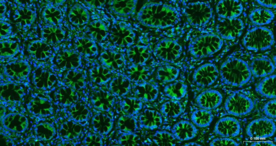 Paraformaldehyde-fixed, paraffin embedded Human Colon; Antigen retrieval by boiling in sodium citrate buffer (pH6.0) for 15 min; Antibody incubation with Beta tubulin Polyclonal Antibody, Unconjugated (bsm-33034R) at 1:200 overnight at 4°C. Followed by conjugated Goat Anti-Rabbit IgG antibody (green, bs-0295G-BF488), DAPI (blue, C02-04002) was used to stain the cell nuclei.