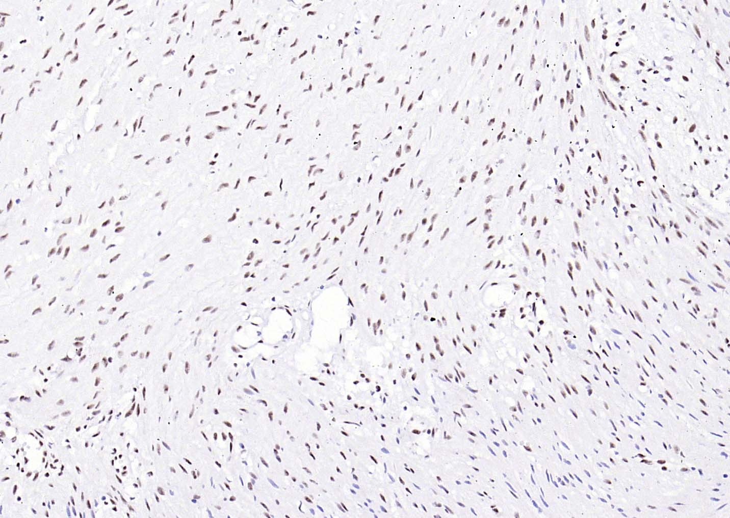 Paraformaldehyde-fixed, paraffin embedded (Human smooth muscle); Antigen retrieval by boiling in sodium citrate buffer (pH6.0) for 15min; Block endogenous peroxidase by 3% hydrogen peroxide for 20 minutes; Blocking buffer (normal goat serum) at 37°C for 30min; Antibody incubation with (YY1(Nuclear Loading Control)) Monoclonal Antibody, Unconjugated (bsm-52349R) at 1:200 overnight at 4°C, followed by operating according to SP Kit(Rabbit) (sp-0023) instructionsand DAB staining.