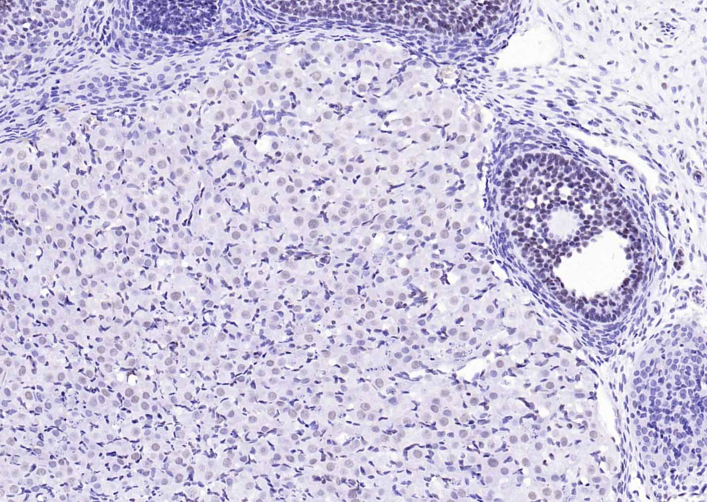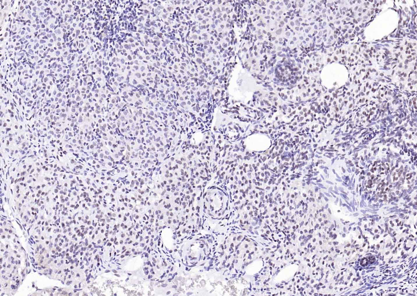 Paraformaldehyde-fixed, paraffin embedded (mouse ovary); Antigen retrieval by boiling in sodium citrate buffer (pH6.0) for 15min; Block endogenous peroxidase by 3% hydrogen peroxide for 20 minutes; Blocking buffer (normal goat serum) at 37°C for 30min; Antibody incubation with (YY1(Nuclear Loading Control)) Monoclonal Antibody, Unconjugated (bsm-52349R) at 1:200 overnight at 4°C, followed by operating according to SP Kit(Rabbit) (sp-0023) instructionsand DAB staining.