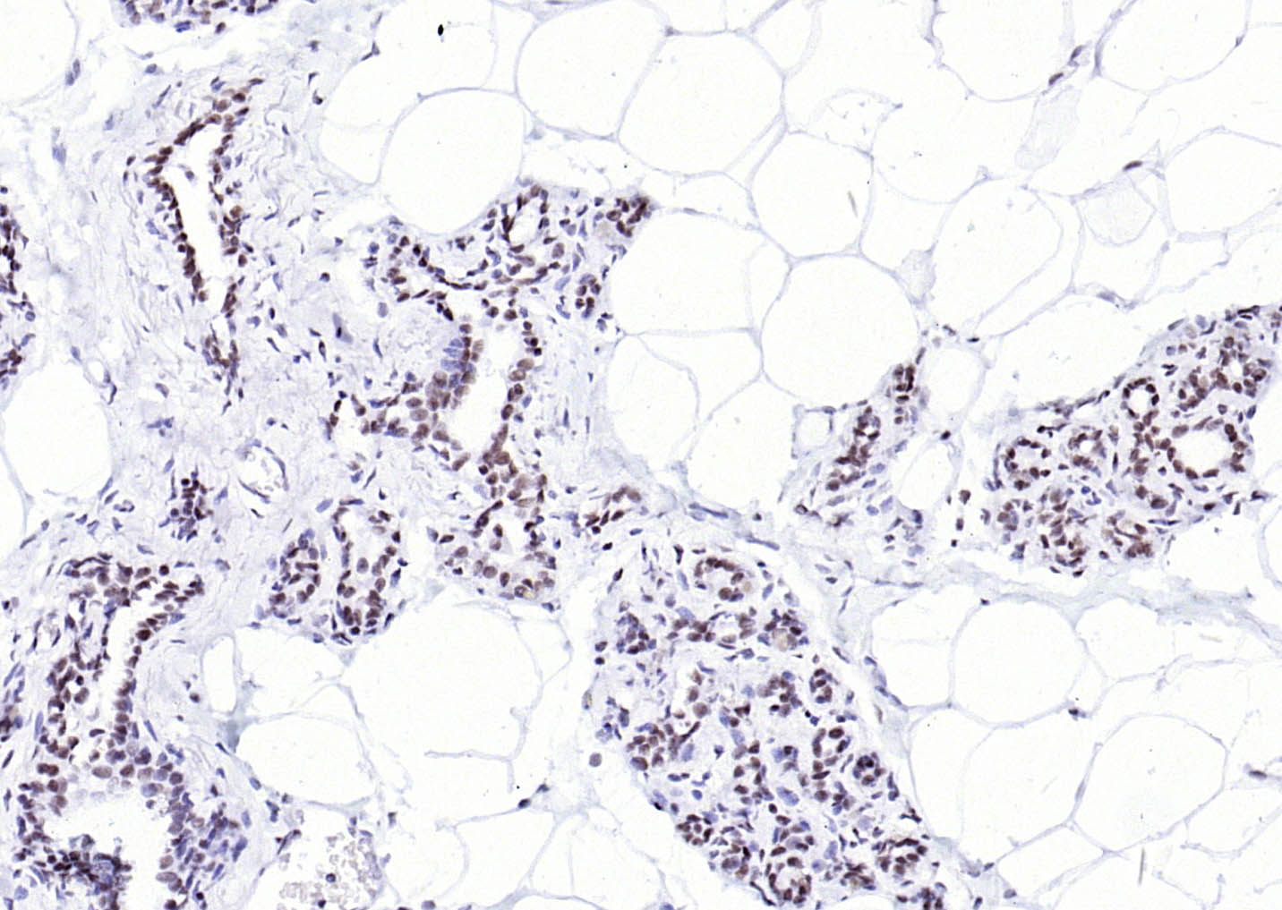 Paraformaldehyde-fixed, paraffin embedded (rat breast); Antigen retrieval by boiling in sodium citrate buffer (pH6.0) for 15min; Block endogenous peroxidase by 3% hydrogen peroxide for 20 minutes; Blocking buffer (normal goat serum) at 37°C for 30min; Antibody incubation with (YY1(Nuclear Loading Control)) Monoclonal Antibody, Unconjugated (bsm-52349R) at 1:200 overnight at 4°C, followed by operating according to SP Kit(Rabbit) (sp-0023) instructionsand DAB staining.