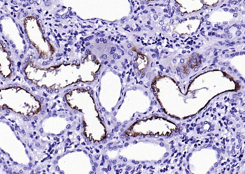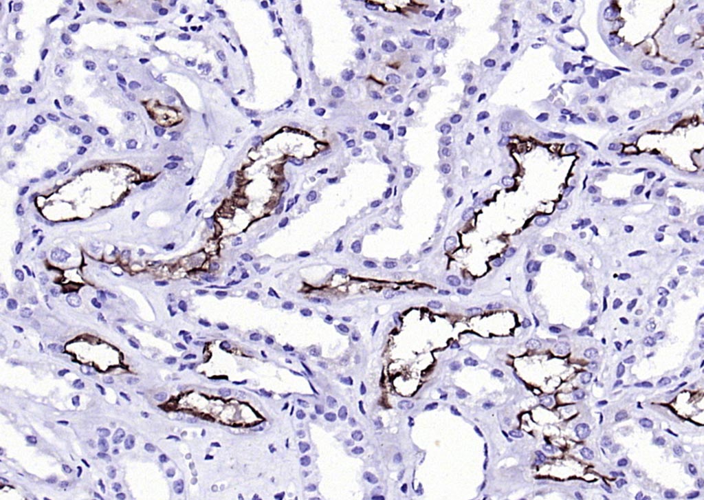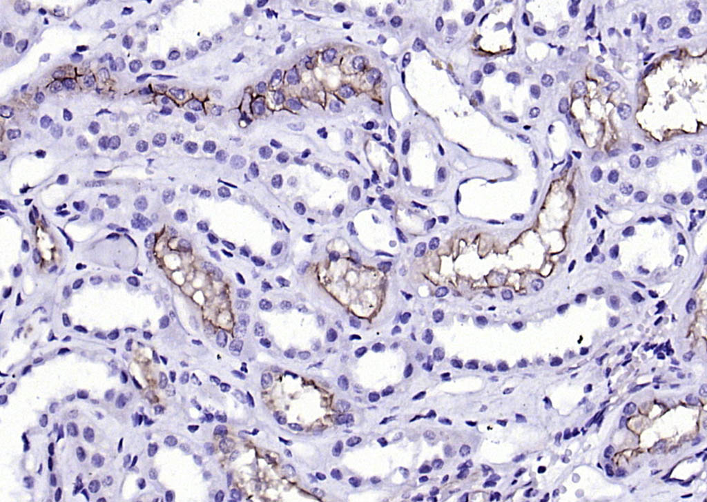 Paraformaldehyde-fixed, paraffin embedded (Human kidney ); Antigen retrieval by boiling in sodium citrate buffer (pH6.0) for 15min; Block endogenous peroxidase by 3% hydrogen peroxide for 20 minutes; Blocking buffer (normal goat serum) at 37°C for 30min; Antibody incubation with (ACE2) Monoclonal Antibody, Unconjugated (bsm-51221M) at 1:200 overnight at 4°C, followed by operating according to SP Kit(Mouse)(sp-0024) instructionsand DAB staining.