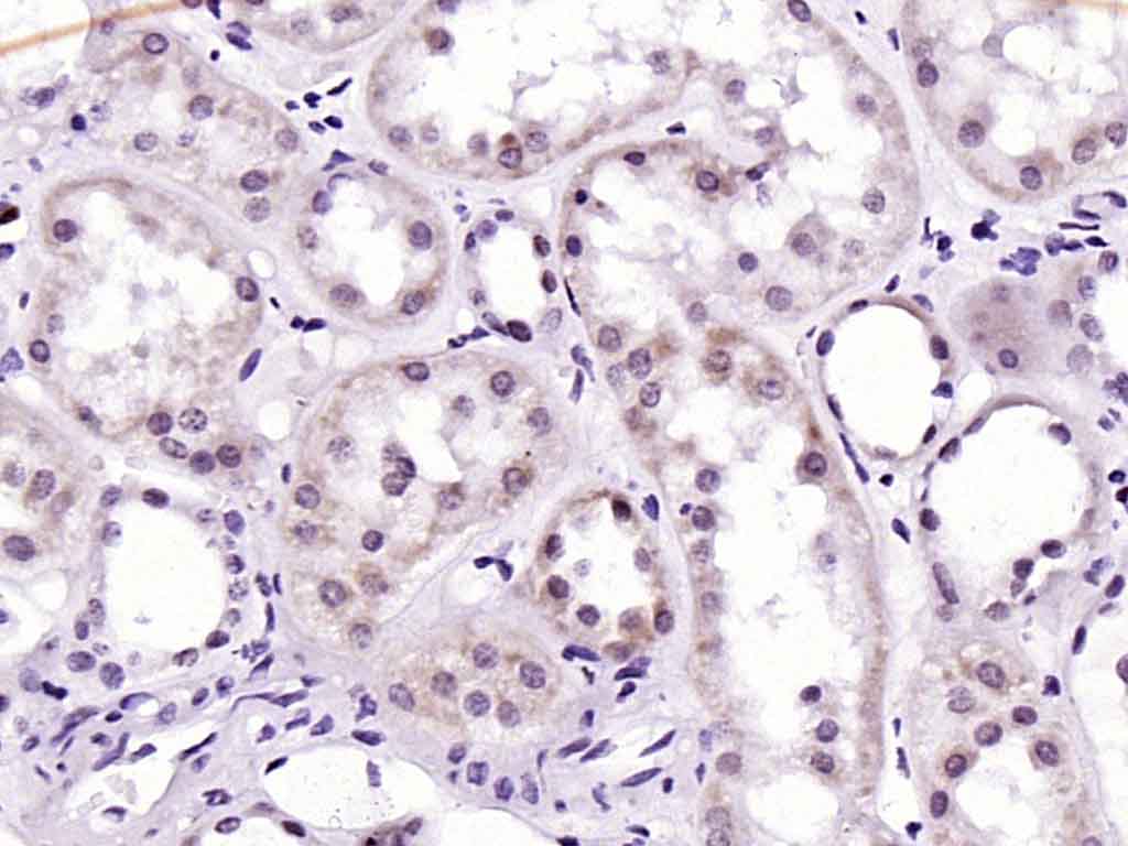 Paraformaldehyde-fixed, paraffin embedded (Human kidney); Antigen retrieval by boiling in sodium citrate buffer (pH6.0) for 15min; Block endogenous peroxidase by 3% hydrogen peroxide for 20 minutes; Blocking buffer (normal goat serum) at 37°C for 30min; Antibody incubation with (ATM) Monoclonal Antibody, Unconjugated (bsm-52360R) at 1:200 overnight at 4°C, followed by operating according to SP Kit(Rabbit) (sp-0023) instructionsand DAB staining.