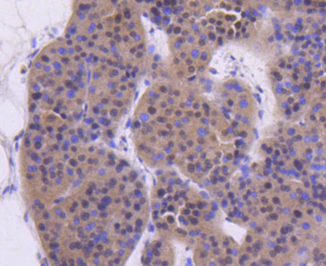 Paraformaldehyde-fixed, paraffin embedded (human pancreas); Antigen retrieval by boiling in sodium citrate buffer (pH6.0) for 15min; Block endogenous peroxidase by 3% hydrogen peroxide for 20 minutes; Blocking buffer (normal goat serum) at 37°C for 30min; Antibody incubation with (ATM) Monoclonal Antibody, Unconjugated (bsm-52360R) at 1:50 overnight at 4°C, followed by operating according to SP Kit(Rabbit) (sp-0023) instructionsand DAB staining.