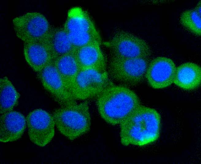 MCF7 cell; 4% Paraformaldehyde-fixed; Triton X-100 at room temperature for 20 min; Blocking buffer (normal goat serum) at 37°C for 20 min; Antibody incubation with (ATM (12A)) Monoclonal Antibody, Unconjugated (bsm-52360R) 1:50, 90 minutes at 37°C; followed by a conjugated Goat Anti-Rabbit IgG antibody at 37°C for 90 minutes, DAPI (blue) was used to stain the cell nuclei.