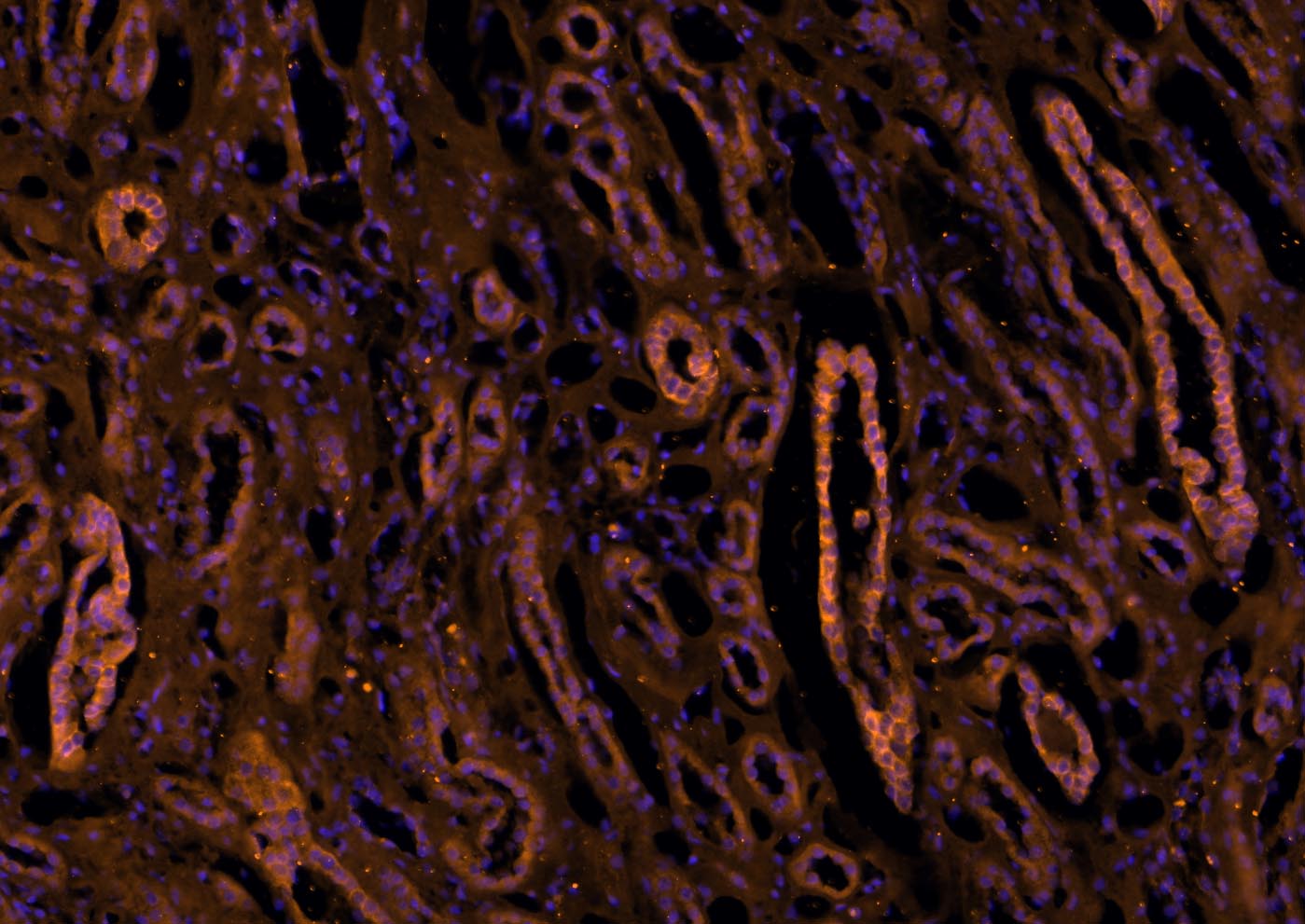 Paraformaldehyde-fixed, paraffin embedded (human kidney); Antigen retrieval by boiling in sodium citrate buffer (pH6.0) for 15min; Blocking buffer (normal goat serum) at 37°C for 30min; Incubation: Anti-Pan Cytokeratin Antibody, conjugated (bs-1712R –AF555) at 1:200 overnight at 4°C; DAPI (5ug/ml, blue, C-0033) was used to stain the cell nuclei.