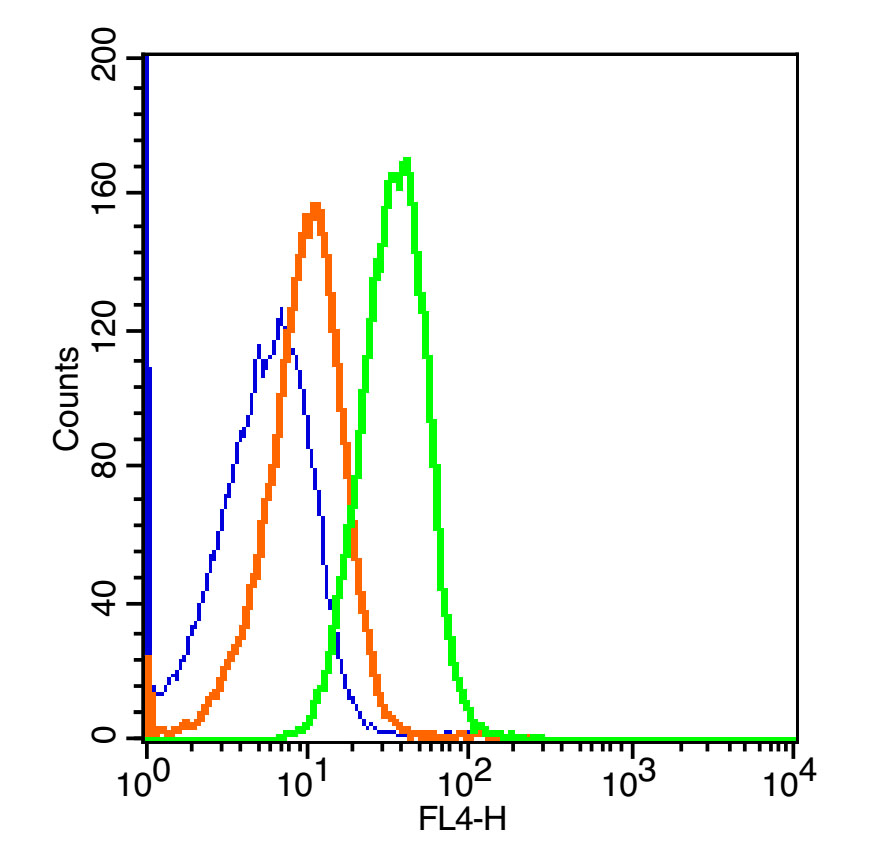 Primary Antibody (green line): Rabbit Anti-phospho-JAK2(Tyr1007+Tyr1008) antibody (bs-2485R-BF647)